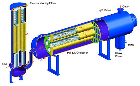 The Pall pre-filter and horizontal liquid/liquid coalescer system are depicted on the last page. The first stage consists of a pre-filter housing that is used to remove solids from the inlet emulsion stream to protect the coalescer and ensure long service life. The pre-filter also functions as a pre-coalescer and starts the fine droplets in the emulsion on their route to forming larger intermediate drops that continue to enlarge in the coalescer medium.